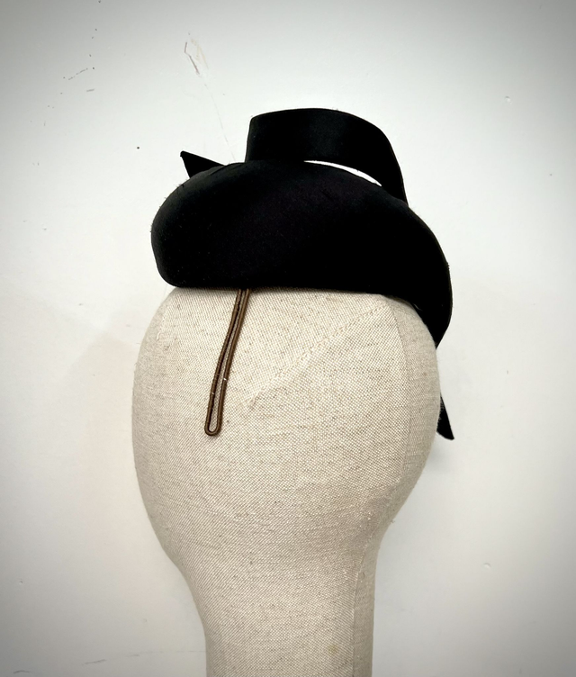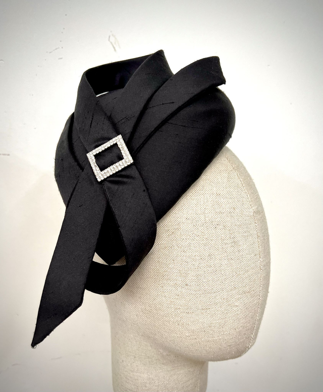 Black silk shantung asymmetric percher with bow and diamente buckle