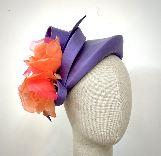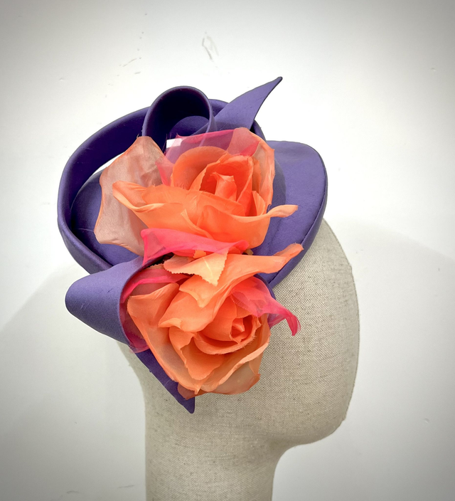 Lilac silk shantung percher trimmed with 2 silk coral roses and bow