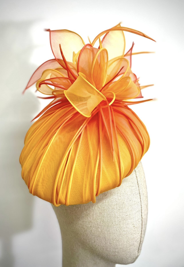 Pink ombre sinamay headpiece with 3 silk roses & crin trim