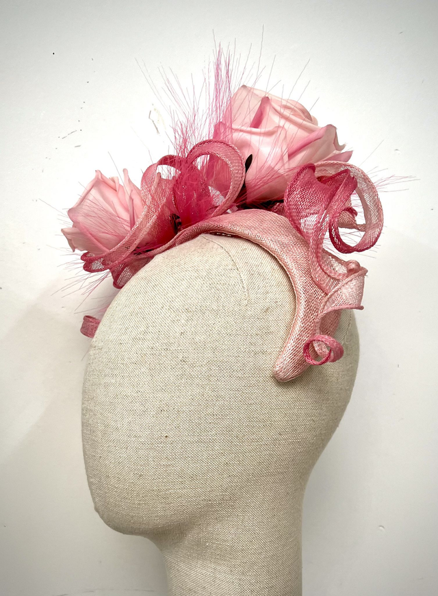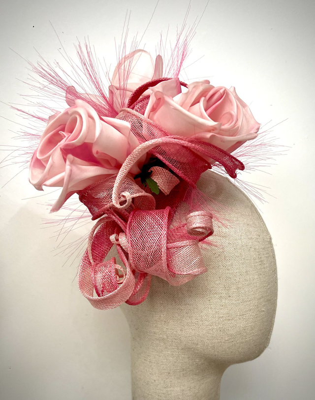 Pink ombre sinamay headpiece with 3 silk roses & crin trim