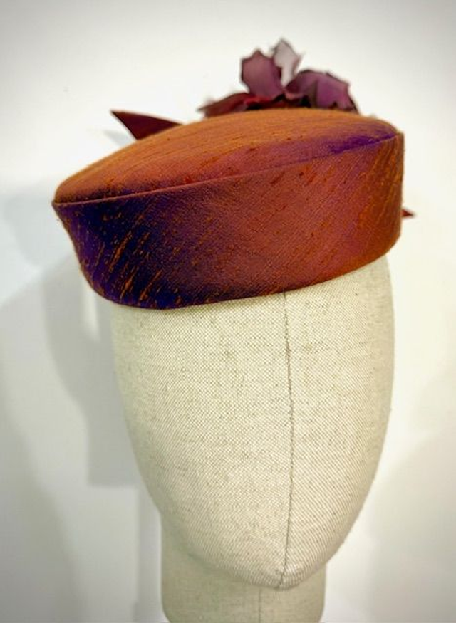 Rust silk pillbox with roses