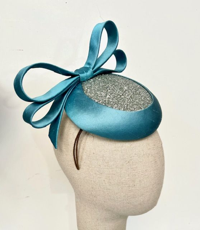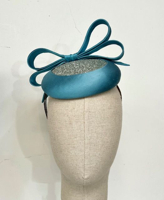 Turquoise silk shantung button beret with silver glitter insert panel
